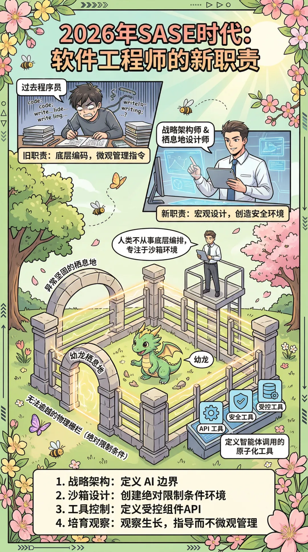 在2026年的SASE时代,软件工程师的职责已经从“编写每一行指令的程序员”演变为“战略架构师”与“栖息地设计师(Habitat Designers)” ⁹。人类不再直接从事底层的逻辑编排与语法构筑,而是专注于设计带有绝对限制条件的沙箱环境,定义智能体可以调用的原子化工具。工程师如同培育一条生长迅速的“幼龙(Baby Dragon)”,不再试图去微观管理它的每一次吐息,而是为其建造一个异常坚固的栖息地,并在四周竖起无法逾越的物理栅栏 ⁹。