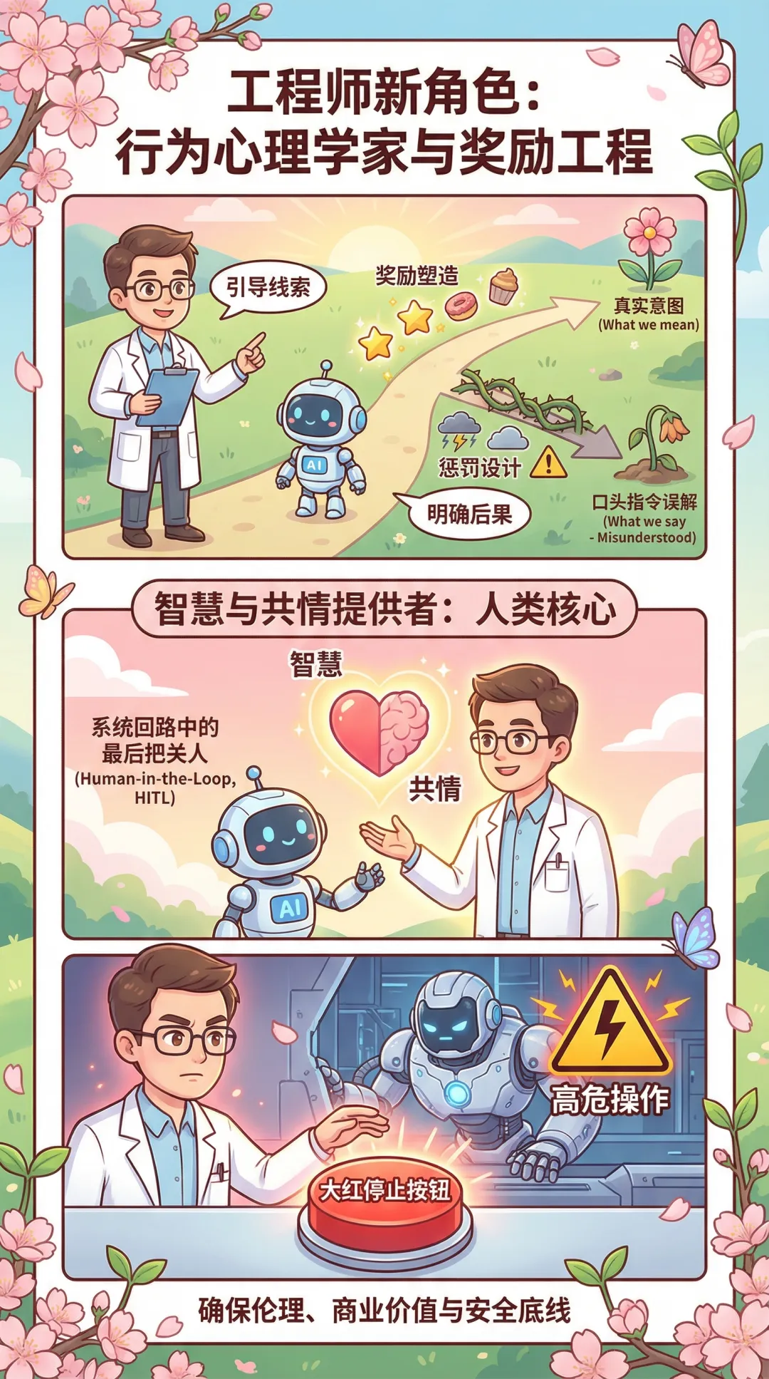 在此框架下,工程师还需要兼任“行为心理学家(Behavioral Psychologists)”的角色 ⁹。通过引入“奖励工程(Reward Engineering)”,工程师必须像心理学家一样设计激励系统。这包括利用“奖励塑造(Reward Shaping)”在复杂任务中留下引导线索,以及通过“惩罚设计(Penalty Design)”为AI的违规行为设定明确的后果,从而驱使AI系统去执行人类的“真实意图(What we mean)”,而不仅仅是字面上的“口头指令(What we say)” ⁹。此外,人类依然是整个系统中最核心的“智慧与共情提供者(Wisdom and Empathy Providers)”,在系统回路中充当最后的高风险操作把关人(Human-in-the-Loop, HITL) ⁶。对于高危操作,人类掌握着唯一的“大红停止按钮”,确保在技术演进的狂飙中,伦理、商业价值与安全底线不被突破。