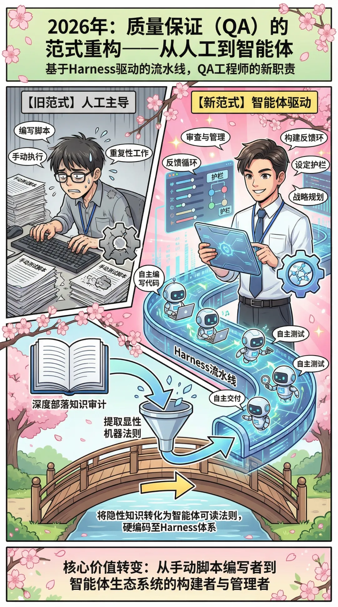随着代码产出从人工向智能体转移,传统的质量保证(QA)团队与流程也经历了范式级别的重构。根据行业观察,在Harness驱动的流水线中,QA工程师的最高价值不再是手动编写测试脚本,而是审查、构建并管理那些允许智能体自主编写、测试并交付代码的反馈循环与护栏 ¹⁰。这要求团队进行深度的部落知识(Tribal Knowledge)审计,将那些散落在开发者大脑中、非正式文档中的质量标准全部提取出来,硬编码至Harness体系中,使隐性知识转化为智能体可读的显性机器法则 ¹⁰。