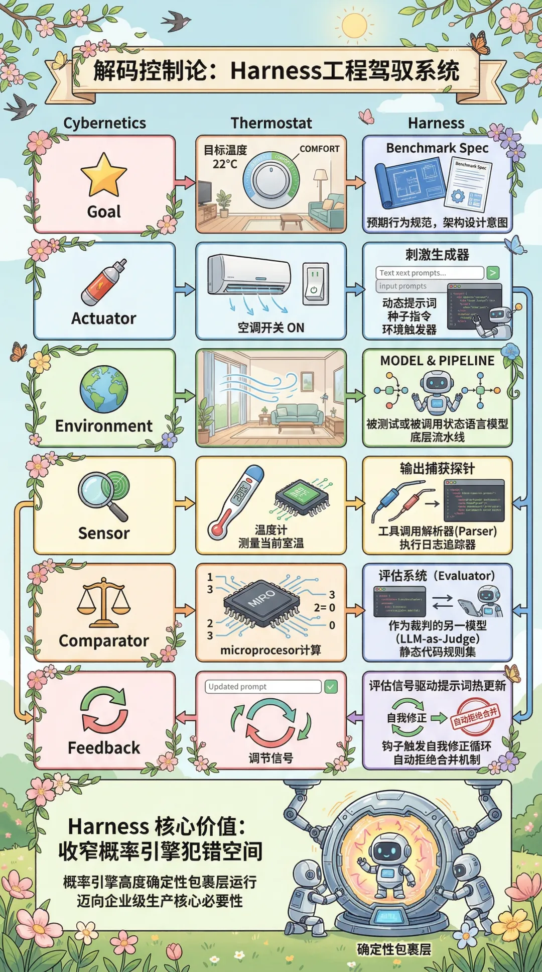 下表展示了控制论核心要素与Harness工程组件之间的严密映射关系,揭示了其作为系统工程的理论正当性: