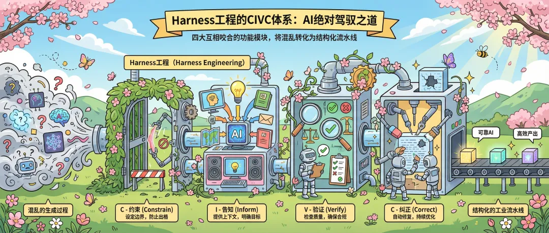 Harness工程在架构上通过四大互相咬合的功能模块来实现对AI的绝对驾驭。这四个模块被称为CIVC体系(Constrain, Inform, Verify, Correct),它们共同将混乱的生成过程转化为结构化的工业流水线 ³。
