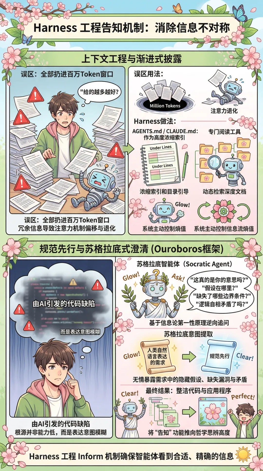 告知机制负责解决信息不对称问题,确保智能体在合适的时间、以合适的格式看到最精确的信息。在Harness工程中,这远远超出了简单地将整个代码库扔进百万Token窗口的粗暴做法。