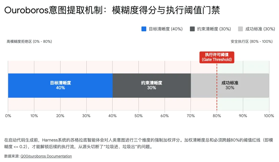 只有当各维度清晰度的加权总和超越了80%(即系统判定的模糊度得分下降至 0.2 甚至更低)时,代表“告知”环节已达到本体论级别的清晰。此时,Ouroboros才会关闭追问模式,将经过千锤百炼的结论结晶为不可变的“种子规范(Seed Specification)”,正式向下游开放代码生成的权限 ¹⁷。
