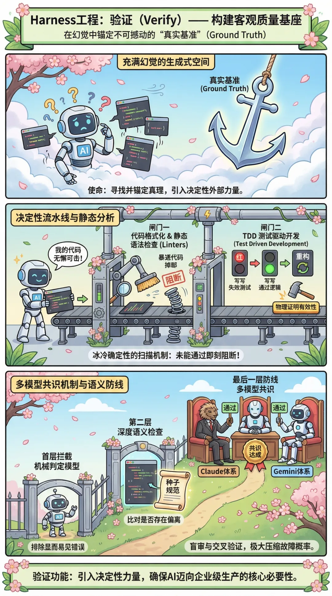 多模型共识机制与语义防线 面对逻辑层面的复杂意图验证,单纯的语法分析显得力不从心。Harness为此设计了逐级升级的质量关卡。例如在多阶段验证网关中,首层拦截是由极其低廉甚至免费的机械判定模型执行,排除显而易见的错误;第二层则是深度语义检查,比对产出物是否与此前的“种子规范”存在偏离;最后一层防线则调动多个来自不同厂商的前沿大模型(如跨越Claude、GPT和Gemini体系)进行盲审与交叉验证(Multi-Model Consensus)。只有在多元智能体达成共识后,该模块才被标记为验证通过,极大地压缩了单一模型盲区所引发的系统性故障概率 ¹⁷。