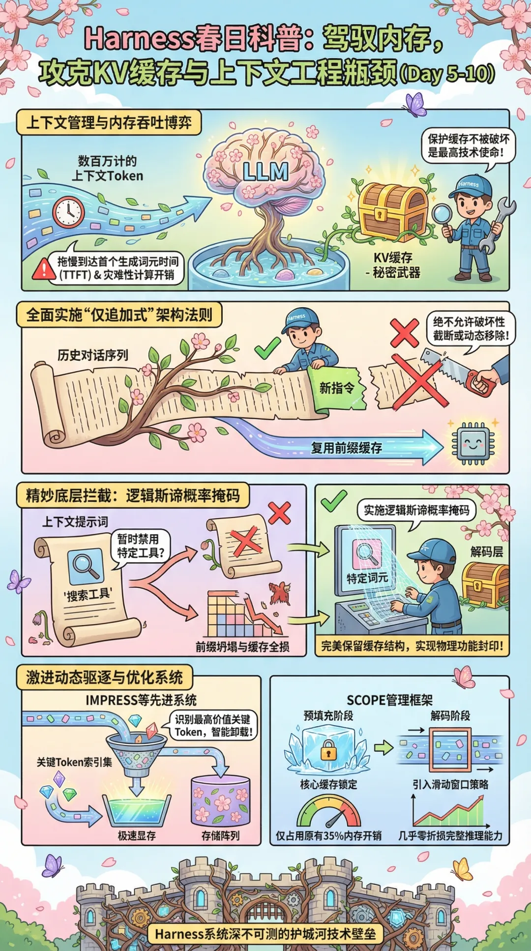 当系统步入生产环境,上下文管理与内存吞吐能力的博弈便成为了决定性战役。处理数以百万计的上下文Token不仅拖慢了到达首个生成词元的时间(Time to First Token, TTFT),更带来了灾难性的计算开销成本 ²⁰。现代Transformer模型的秘密武器在于重用键值缓存(Key-Value Cache,KV Cache),而保护缓存不被破坏是Harness工程师的最高技术使命之一 ²⁰。