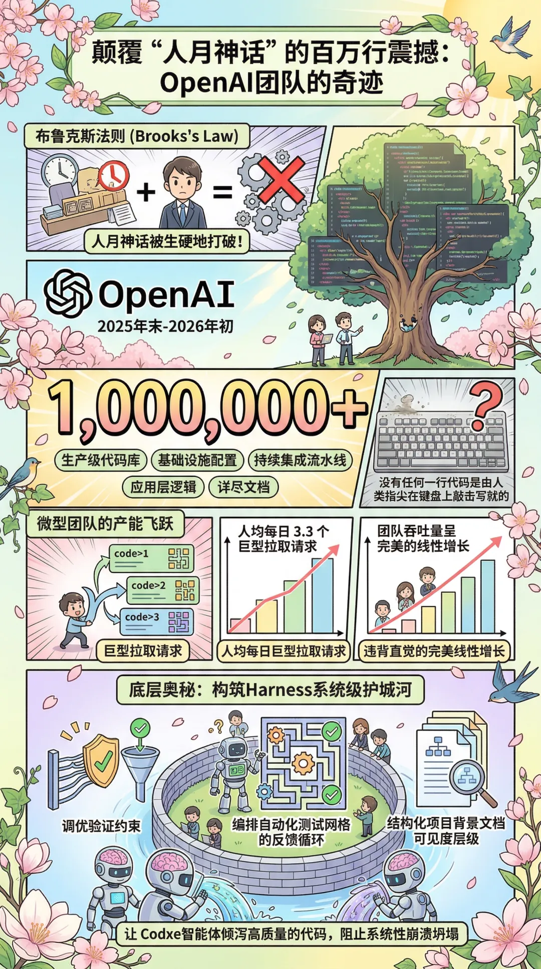 软件工程界长久以来奉行着“布鲁克斯法则(Brooks’s Law)”,即向一个已经延期的项目中增加人手只会使其更加延期。然而,在2025年末至2026年初,OpenAI内部的一个小型的核心研发小组却生硬地打破了这一铁律 ⁷。他们面对的是一个包含基础设施配置、持续集成流水线、应用层逻辑及详尽文档在内、总规模突破一百万行的庞大生产级代码库的构建任务。最令人震撼的是,在这浩如烟海的代码海洋中,竟没有任何一行代码是由人类开发者的指尖在键盘上敲击写就的 ³。