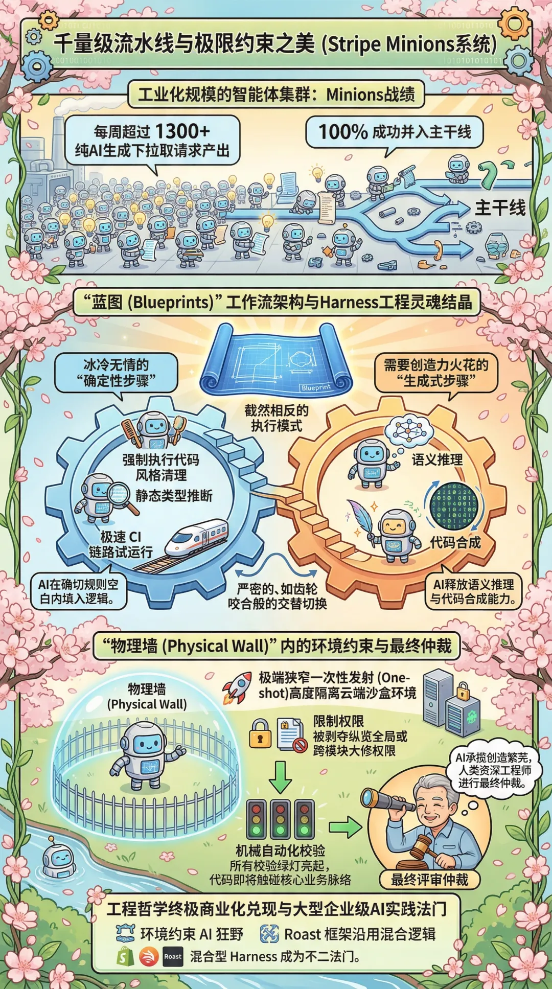 在金融基础设施巨头Stripe的研发大厅里,同样的故事正以惊人的工业化规模上演。Stripe向外界公开披露了其内部代码名为“Minions”的自主编码智能体集群的惊人战绩:该系统常态化地保持着每周超过1300个纯AI生成的高质量拉取请求的产出量,并且全部成功并入主干线 ⁶。