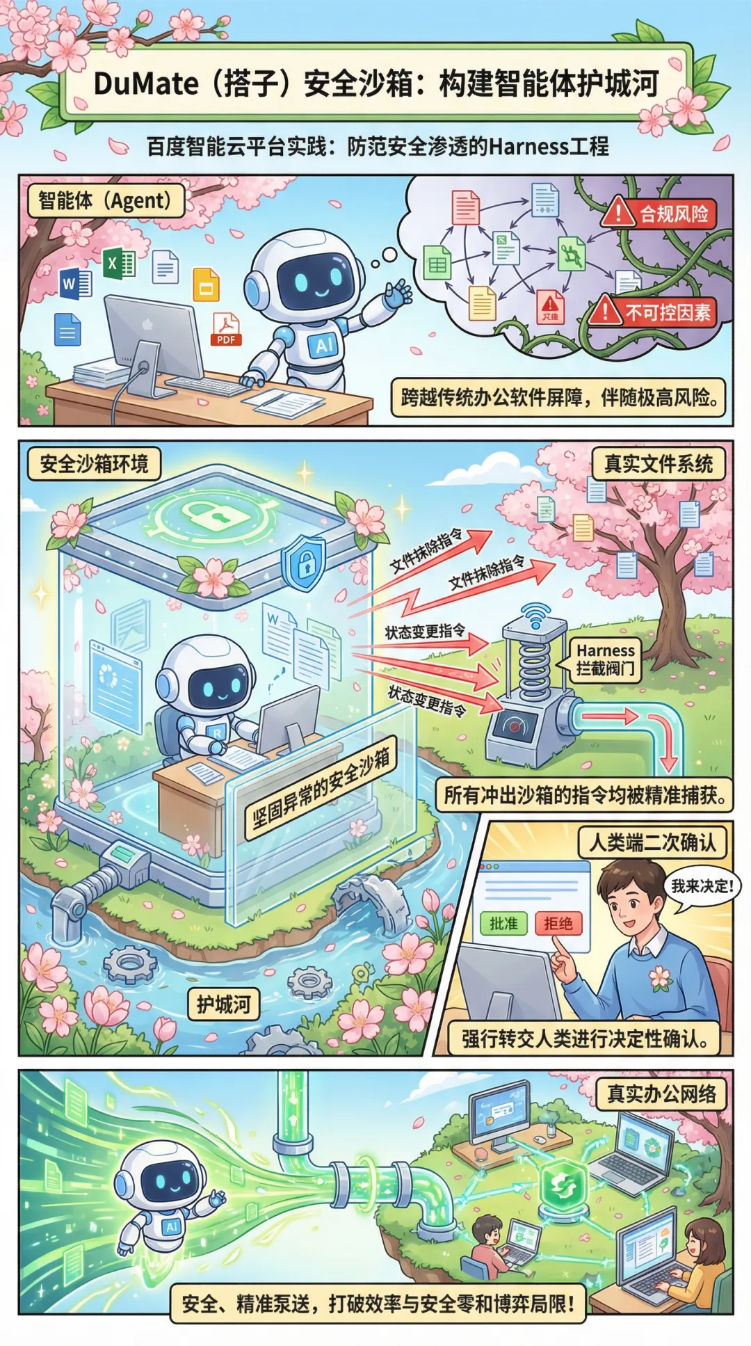 在全球范围的实践中,百度的智能云平台通过其落地的DuMate(搭子)产品,直观地呈现了Harness工程在防范安全渗透方面的巨大潜力 ²。作为一个不再局限于单纯对话,而是能够横跨Word、Excel等传统办公软件屏障、跨越不同文件格式进行自主流转的智能体,其每一次向系统外部的延伸都伴随着极高的合规风险 ²。为了将模型的不可控因素死死锁在容器之内,DuMate在系统架构的最底层原生地铸造了一个坚固异常的安全沙箱环境。一切由模型催生的文件抹除或状态变更指令,在试图冲出沙箱触碰真实文件系统的那一刻,均会被极其灵敏的Harness拦截阀门精准捕获,并无一例外地强行转交至人类端进行决定性的二次确认 ²。通过这种强硬的物理隔断与权限隔离,AI的能力被安全、精准地泵送至错综复杂的真实办公网络之中,彻底打破了效率与安全之间的零和博弈局限 ²。