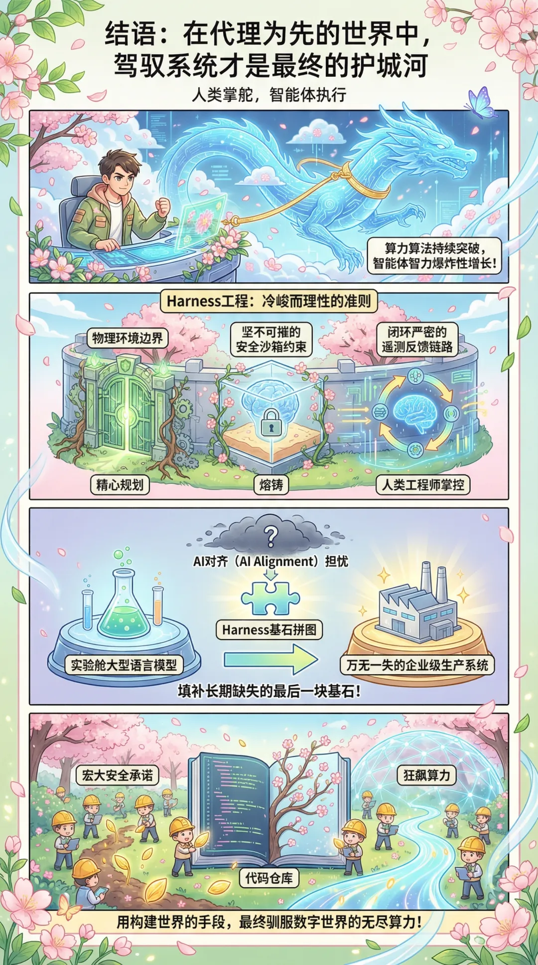 “人类掌舵,智能体执行”。在不可预见的未来,随着算力算法的持续突破,智能体所能触及的智力天花板必然还会迎来数次爆炸性的增长。然而,无论巨龙如何迅速地发育,只要驾驭这些超级算力的物理环境边界、坚不可摧的安全沙箱约束、闭环严密的遥测反馈链路,始终是由人类工程师在Harness工程那套冷峻而理性的准则下精心规划与熔铸的,那么那些长久以来萦绕在学术界上空的、关于AI技术与人类利益对齐(AI Alignment)的深刻哲学担忧,便不再是悬在半空、虚无缥缈的清谈。Harness工程已经填补了处于实验舱的大型语言模型,与那些要求万无一失的企业级生产系统之间长期缺失的最后一块基石拼图 ¹²。成千上万的工程师们,正通过这套前所未有的工程范式,将那些宏大的安全承诺,一行行深植于代码仓库的最底层,用构建世界的手段,来最终驯服那些在数字世界中狂飙的无尽算力。