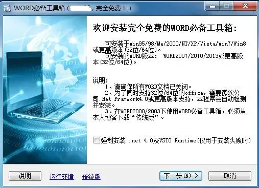 已测试的运行环境: Win95/98/Me/2000/NT/XP/Vista/Win7/Win8/Win10 (32位/64位)可运行的Word版本: WORD2007/2010/2013/2016/2019/365 (32位/64位)可运行的WPS版本: 2014年11月抢先版或更高版本提示: 当你对某个功能不了解时,按住Ctrl键再单击WORD必备工具箱功能可以自动打开帮助网页,指导你正确地操作,从而迅速掌握每个功能。