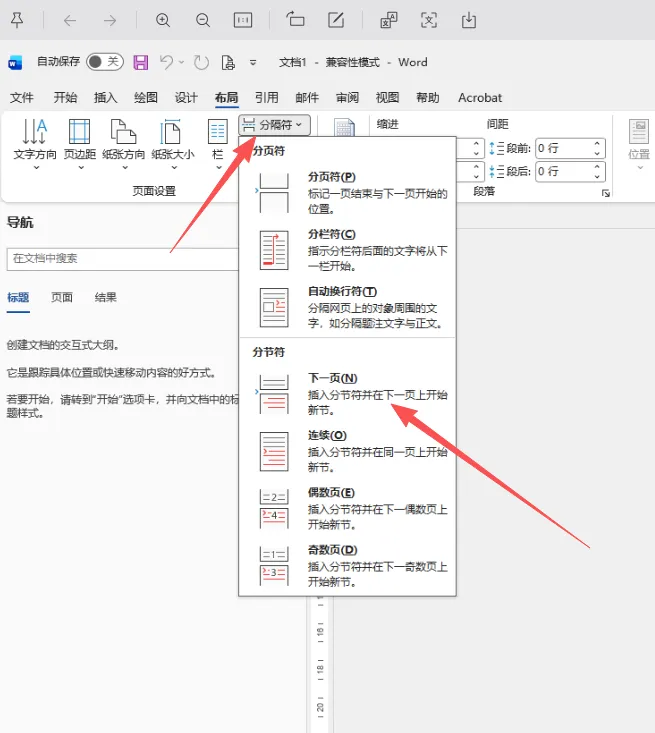 如果换页后要重新排页码,就用布局→分隔符→下一页。这样换页是插下下一节,可以在下一页开始重新编排页码。