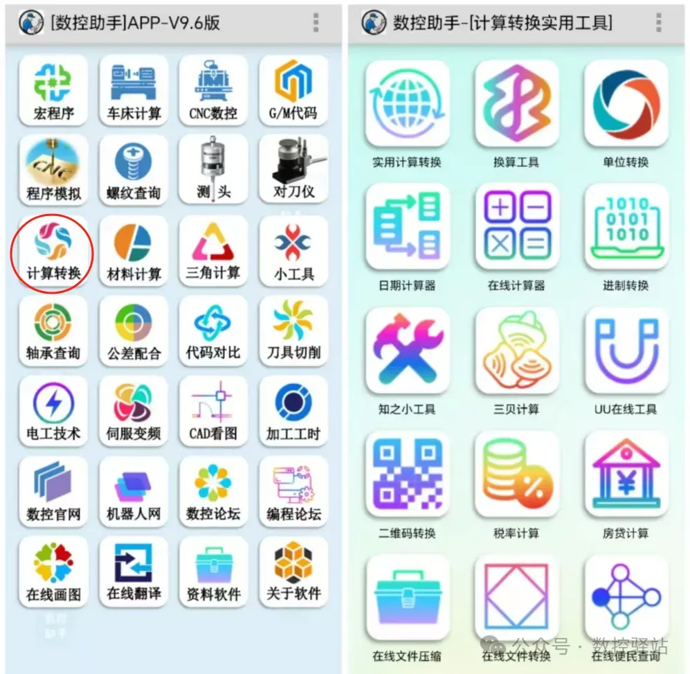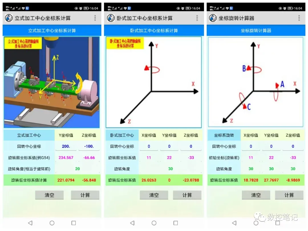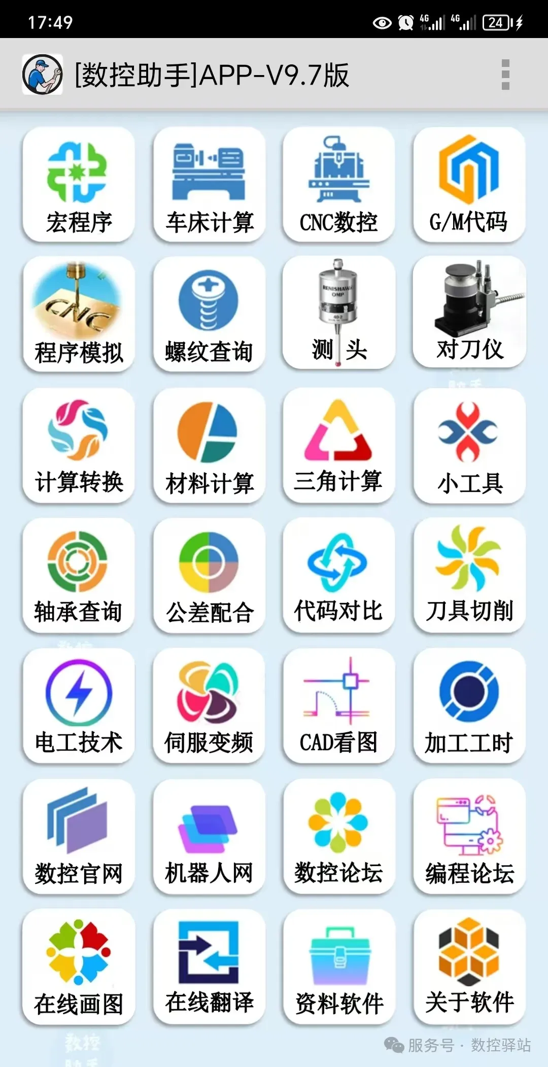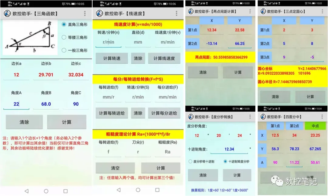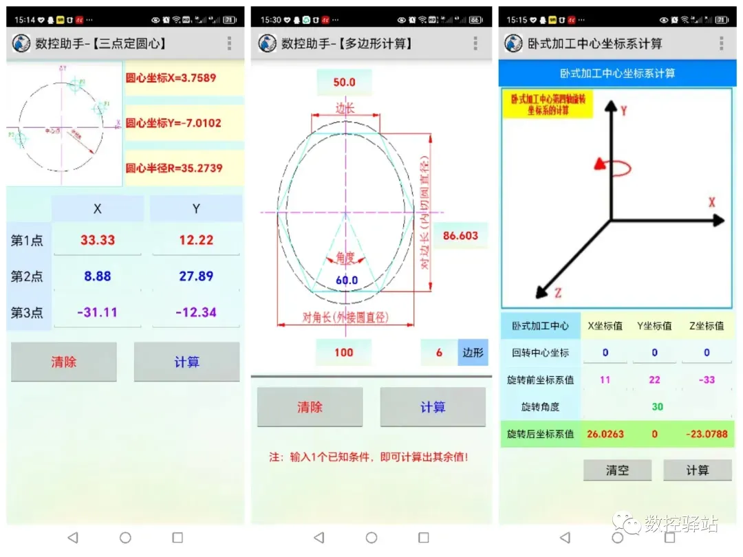 两点间距、三点定圆心、四面分中圆周孔孔距、极坐标转换、坐标旋转,坐标旋转计算器,多边形、员心点坐标、进制换算、线速度、粗糙度、度分秒转换、圆锥计算、倒角计算、重量公式、公英制转换燕尾磨量、攻丝扭矩、特种作业证查询、美国寿力解密、等功能。