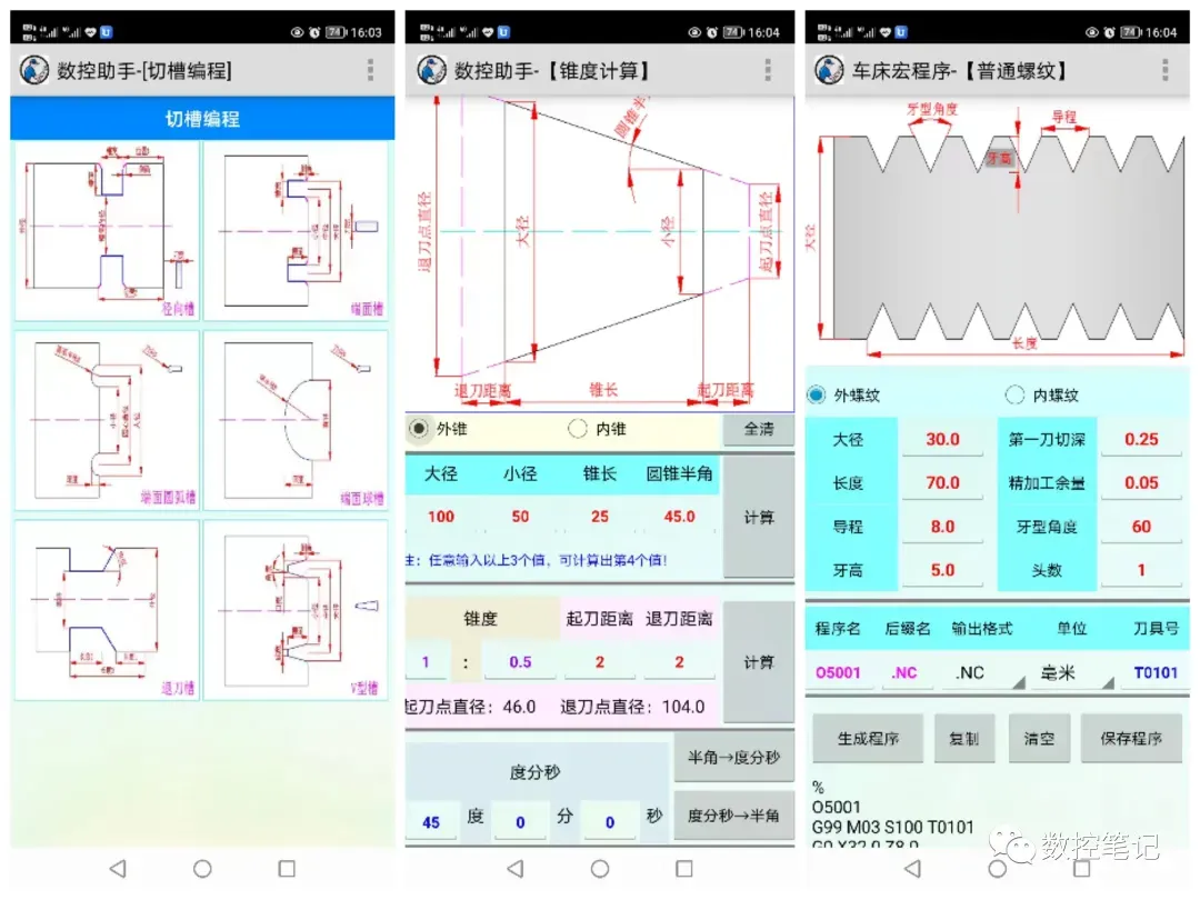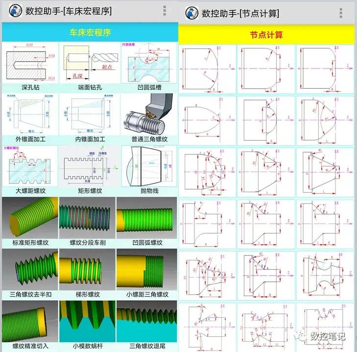 具有42项车床宏程序、37项节点计算、16项成型加工、18项切槽编程 等常用模板,具有角度计算、锥度计算、刀尖方位、普通螺纹等功能…
