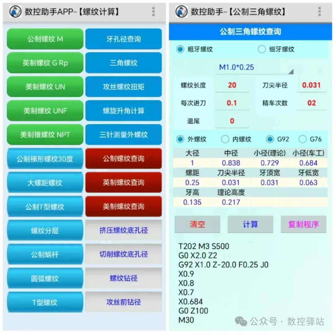 三角螺纹、牙孔径查询、攻丝螺纹扭矩、螺纹底孔径、螺纹钻径、攻丝前钻径、公制/美制/英制螺纹查询等功能。