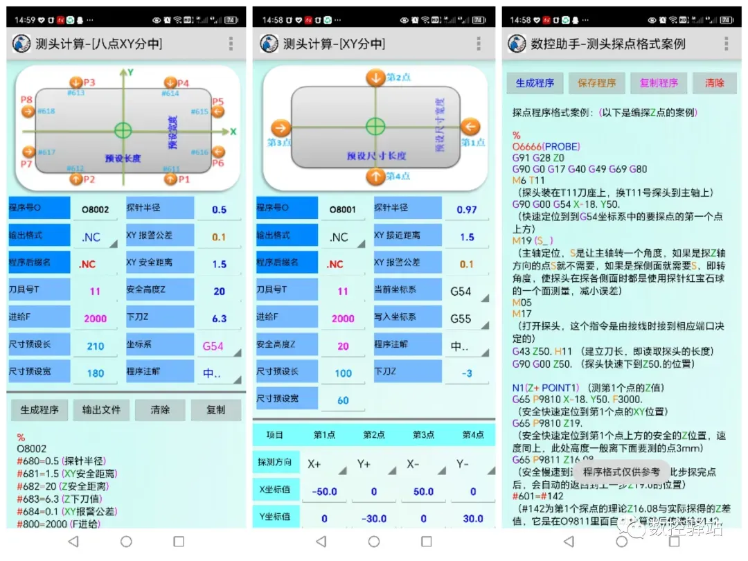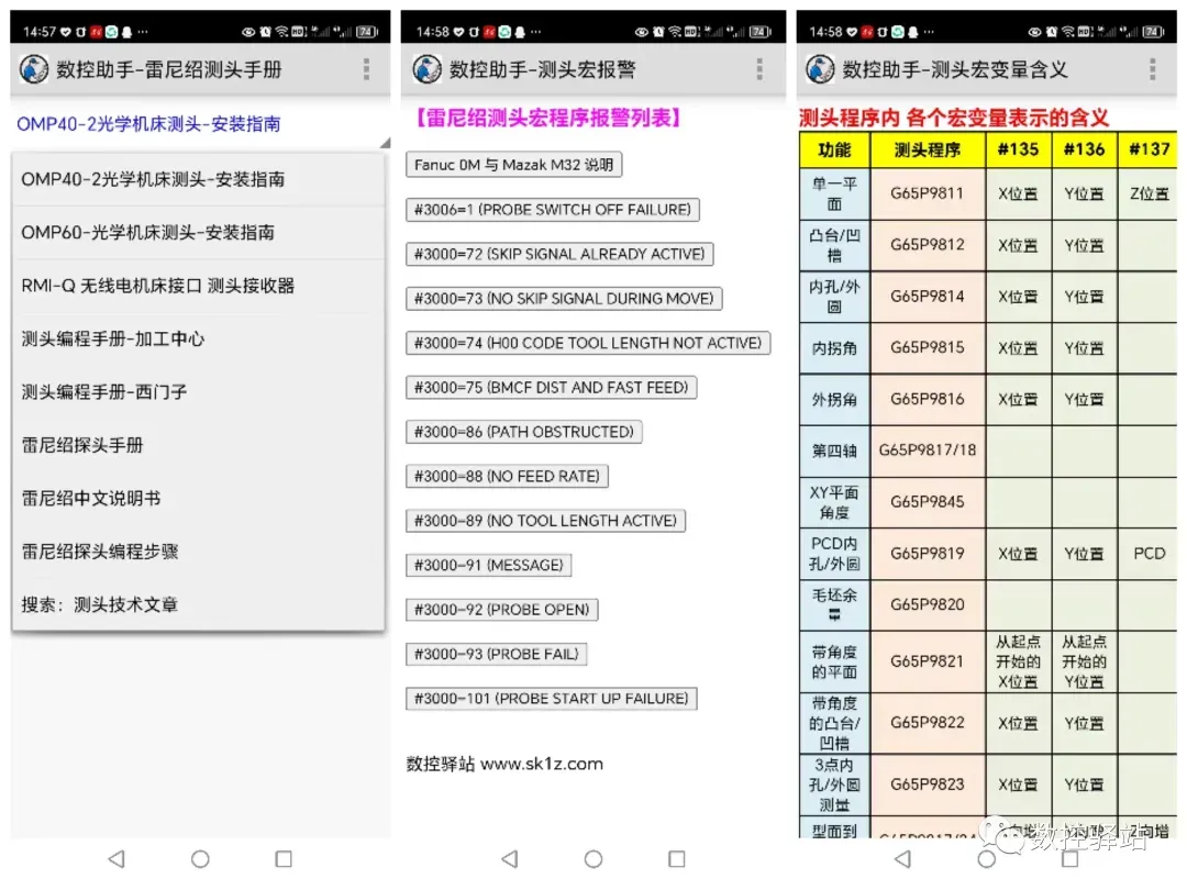 查询测头宏程序、测头程序详解各类测头手册、测头宏报警、测头宏变量、探点格式案例、XY分中、八点分中等功能、可下载雷尼绍专用APP软件。