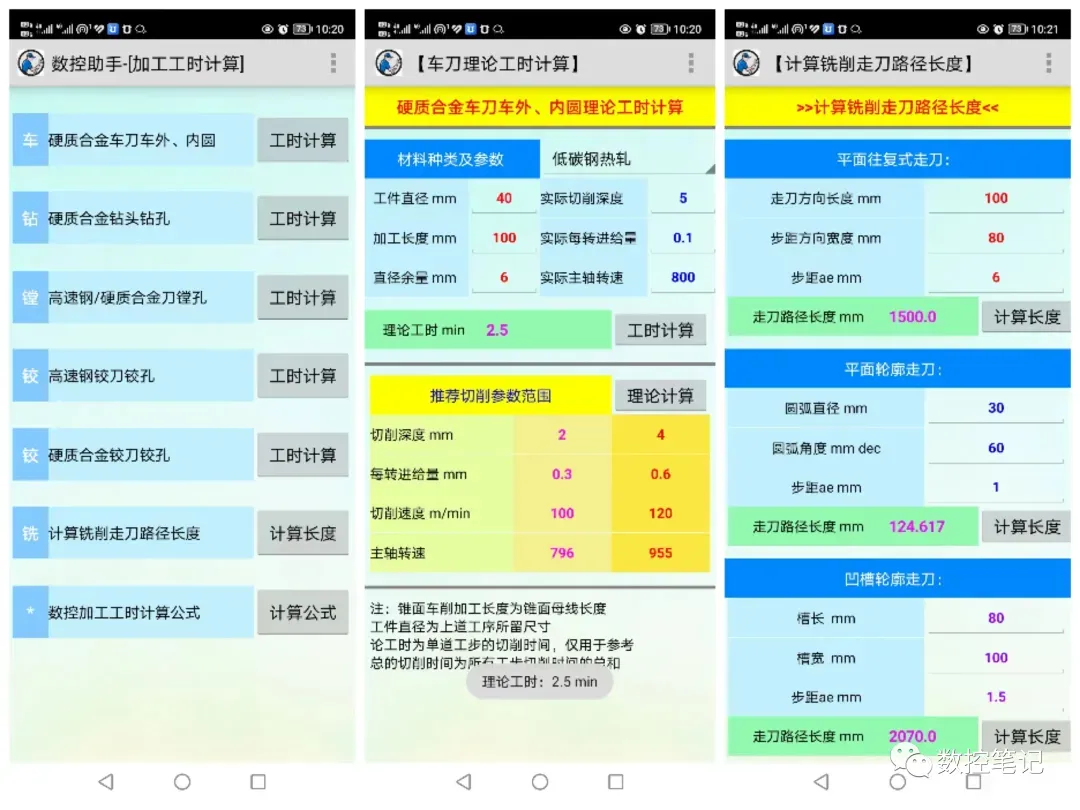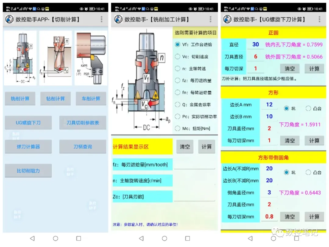 铣削计算、钻削计算、车削计算UG螺旋下刀、球刀计算器、刀柄查询、刀具切削参数表、比切削阻力等功能。