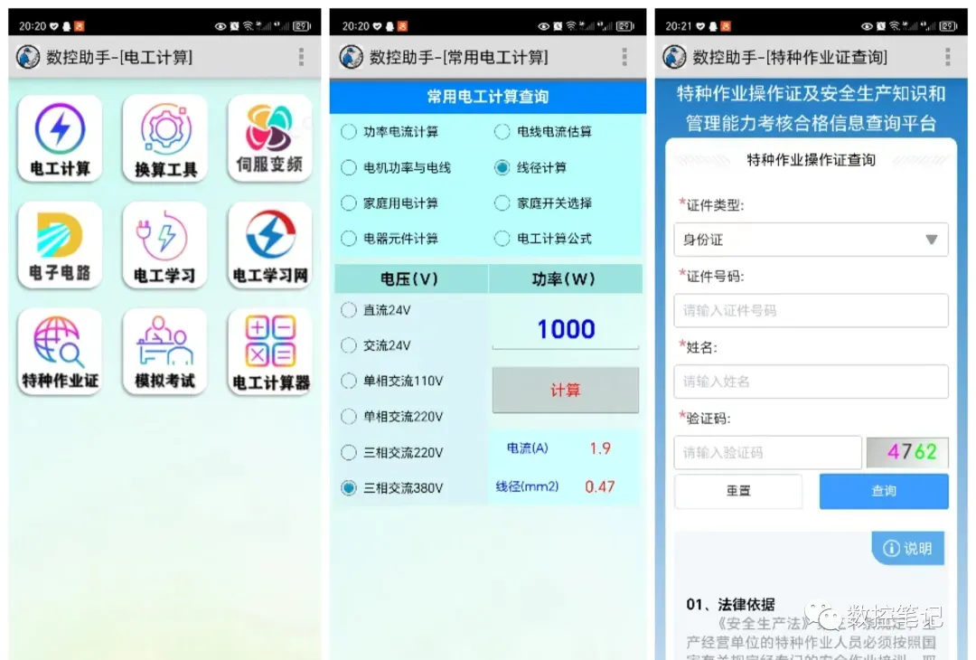功率电流计算、电线电流估算、电机功率载流、线径电流计算、功率单位换算、伺服变频手册查询、电子电路计算、电子类相关实用计算查询工具大全、电工学习、电工论坛、特种作业证查询、电工模拟考试、电工计算器APP下载 等功能