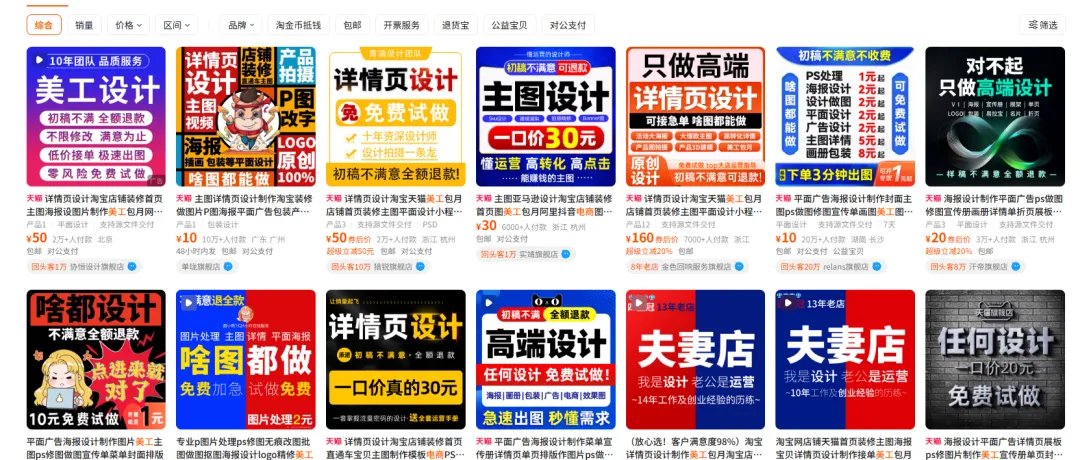 我放的这个截图里你看着是什么10、20、50但实际上不可能这么便宜的。你随便点进去一个咨询客服。问一下做一套详情页多少钱,他就会告诉你最便宜都是100多起步,有些复杂的产品甚至要三四千。就是做一套详情图。