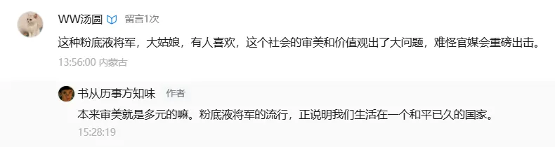 这种粉底液将军,大姑娘,有人喜欢,这个社会的审美和价值观出了大问题,难怪官媒会重磅出击。