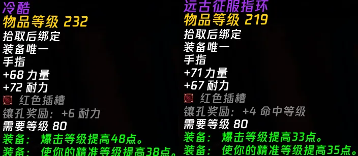 在魔兽世界泰坦重铸时光服里,数值体系的问题似乎如影随形,一直困扰着众多玩家,不少装备的实际数值与它们的装等严重不匹配,让人十分费解。就拿Naxx掉落的【冷酷】来说,这件装备等级高达232,按常理其属性应该相当出色。然而,它的力量加成却低得离谱,甚至比不上装等只有219的【远古征服指环】。