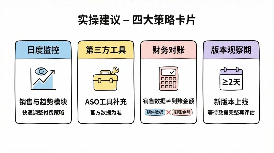 • 周度/月度复盘:App 分析模块,等待数据完整后再决策,避免用临时数据误判