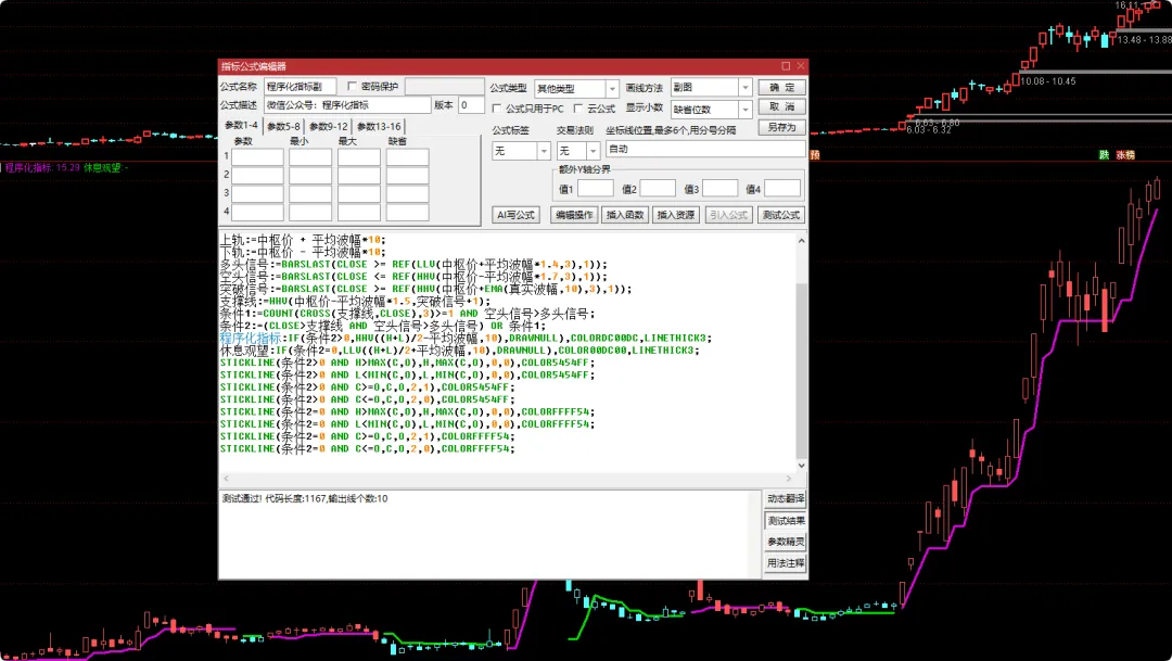 程序化指标:IF(条件2>0,HHV((H+L)/2-平均波幅,10),DRAWNULL),COLORDC00DC,LINETHICK3;