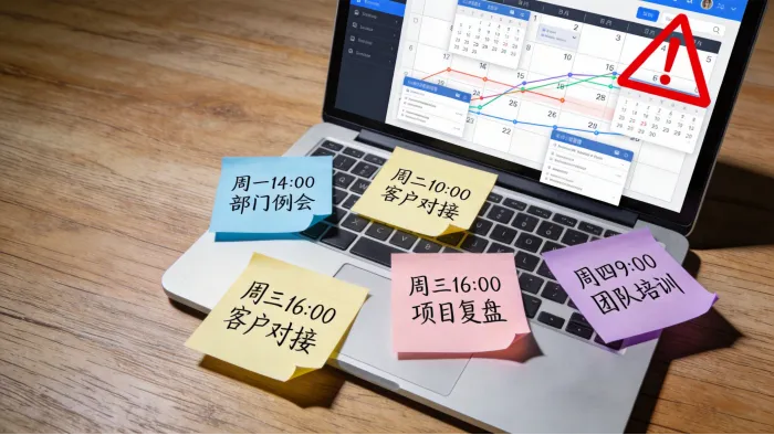 桌面贴满便利贴,日历里会议重叠,红色冲突警告频出,重要工作被挤压到深夜。