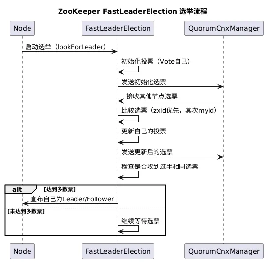 FastLeaderElection是ZooKeeper默认采用的选举算法,其核心思想是通过选票广播与比较,让集群节点快速达成一致。以下是算法的核心流程: