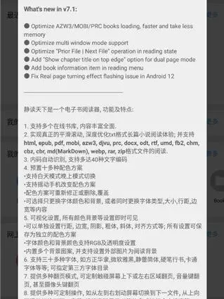 ✅支持txt、html、epub、mobi、fb2、umd、chm、cbr、cbz、rar、zip、OPDS等几乎全部格式;支持四十多种编码、三十多种字体;内建十种配色方案,支持白天/夜间模式;十多种翻页模式,五种自动滚屏方案;专业版移除广告,支持语音朗读、PDF阅读、简繁转换等增强功能。