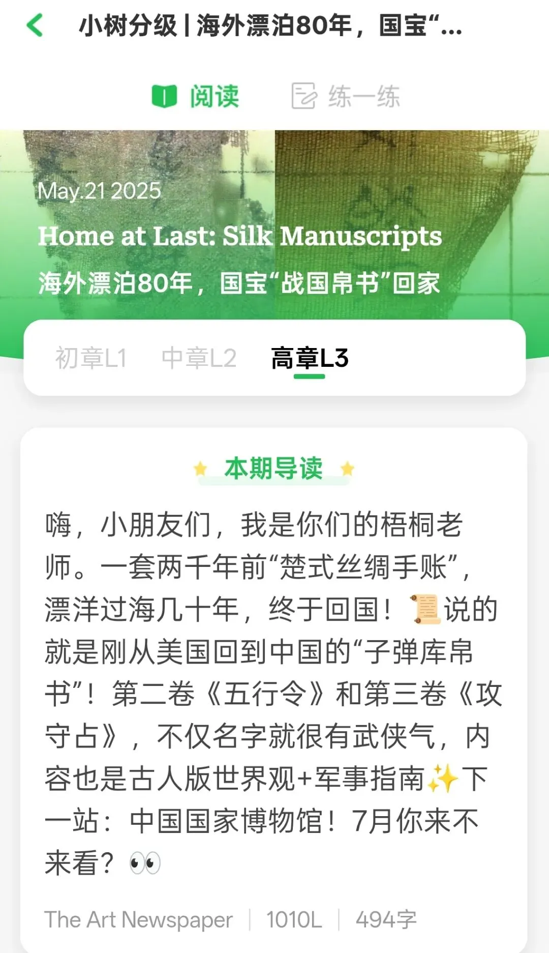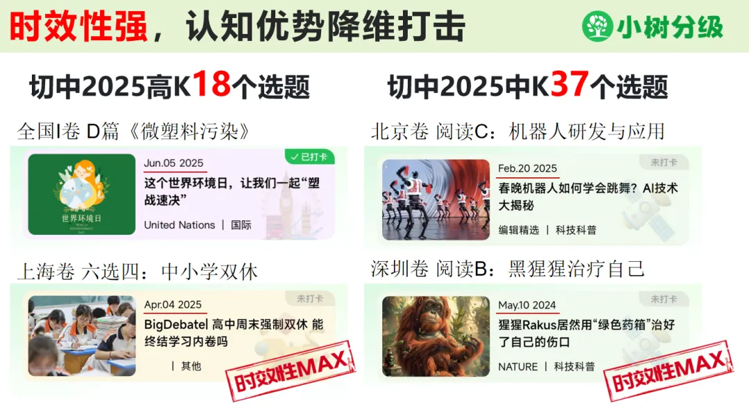 现在中考高考英语阅读,越来越偏向时事和外刊,上海高考阅读蓝思值已经能到1200-1400L,小树早就把最高级别蓝思提到了1400L,完全对接升学需求。它本身就是每天更新新鲜的新闻,和高考阅读选材逻辑一模一样,孩子平时读惯了,上考场看到外刊素材不会慌。