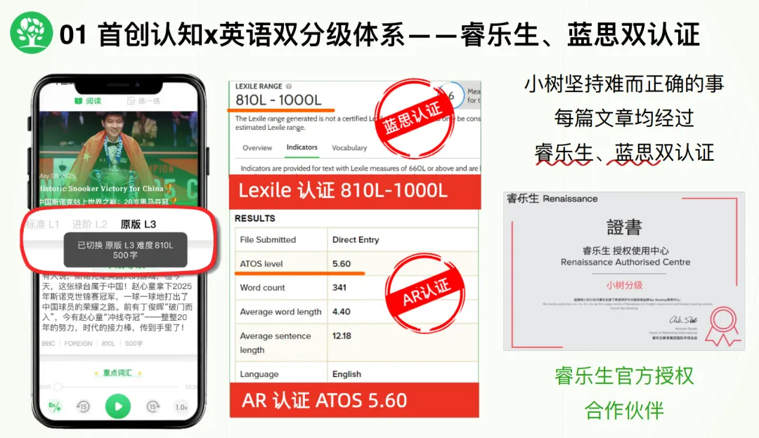 小树分级的专业,最让我佩服的是对分级的死磕。现在很多分级阅读产品,定级就是老师凭经验拍脑袋,蓝思值标得乱七八糟。但小树不一样,每一篇外教写完,都会同时送到蓝思和AR两个专业测评系统定级