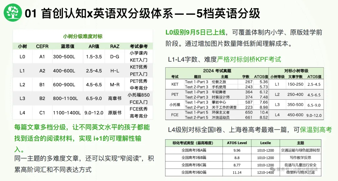 最初小树参考国际通用CEFR体系定了L1-L4,第一版L4蓝思上限是1000-1200,后来收到上海头部私立初一优秀孩子家长反馈,说孩子还想读更难的,对接高考需求。团队立刻把近年全国高考卷全都调研了一遍:全国一卷最难阅读已经到1200-1400,上海高考最难能到1200-1400,当下就把L4蓝思上限提到了1400,完全贴合国内升学的难度趋势。