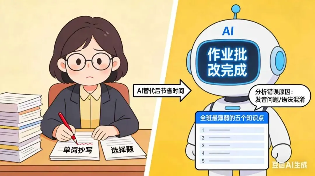 AI是高效的“批改员”。 过去,老师花大量时间批改单词书写、选择题等客观题,疲惫且低效。家长们在辅导功课时有同样的烦恼。现在,AI可以快速完成这类批改,并生成数据统计,如全班的薄弱点、学生表现变化曲线等。老师和家长能通过客观数据,而不是主观印象来分析学生表现,从而更有针对性地改进,AI节省出的时间,解放了人的大脑,给了大家思考与发挥创意的空间。