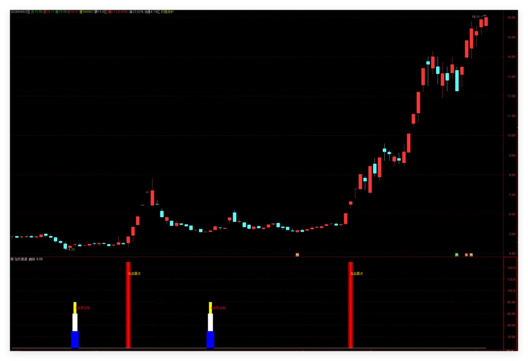 副图会画出一组蓝色渐变柱(从深蓝到亮蓝),高度从0到150,顶部标注黄色文字”龙起暴点”。