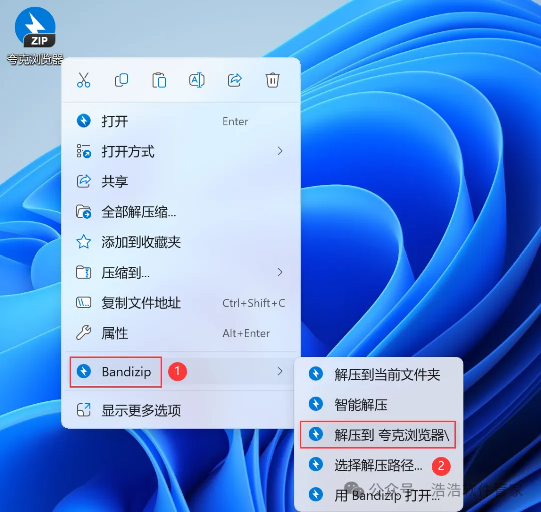 1、下载夸克浏览器软件安装包到电脑上,右键选择【解压到夸克浏览器\】