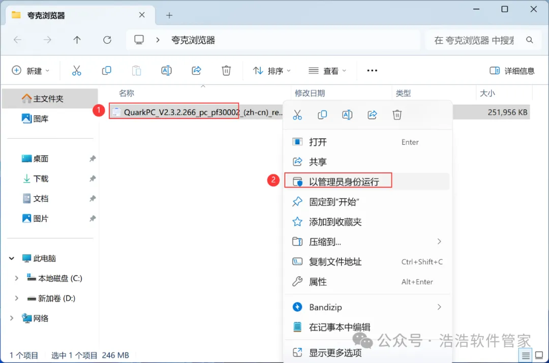 3、找到【夸克浏览器】应用程序,右键选择【以管理员身份运行】它