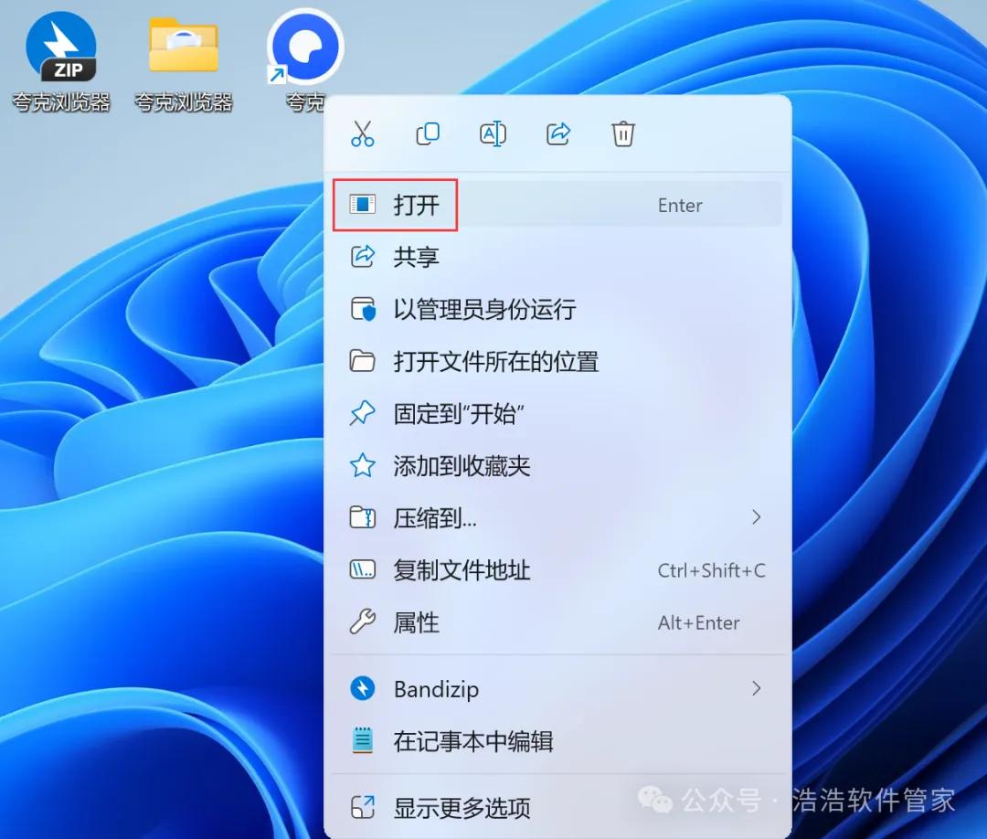 8、回到桌面,右键桌面上的【夸克浏览器软件图标】,点击【打开】