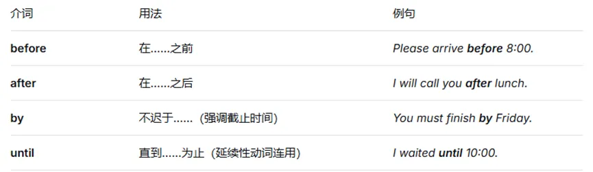 (2)before, after, by, until