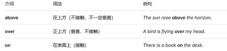 这里【above, over】以及【below, under】的区别有些类似,可以放在一起记忆。above表示的是相对高度超过(A比B更高),但具体位置可以很泛,而over则表达的是正上方,有表示具体点位的意思