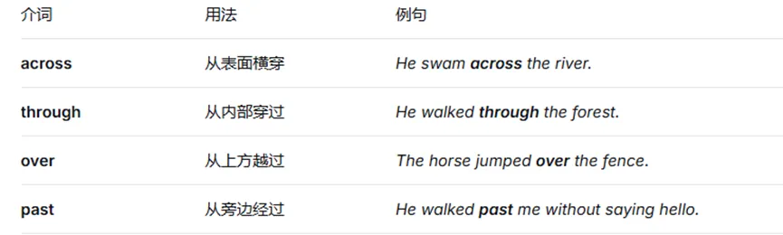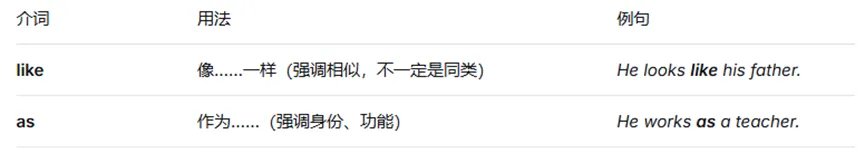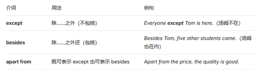 区分易混介词:except/besides、like/as、across/through 等