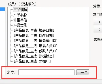 如果我们设计的数据表字段较多,在「成员」窗口中一个个查找目标字段,会非常繁琐。这时可以利用表达式窗口下方的「定位窗口」,快速找到需要的字段。
