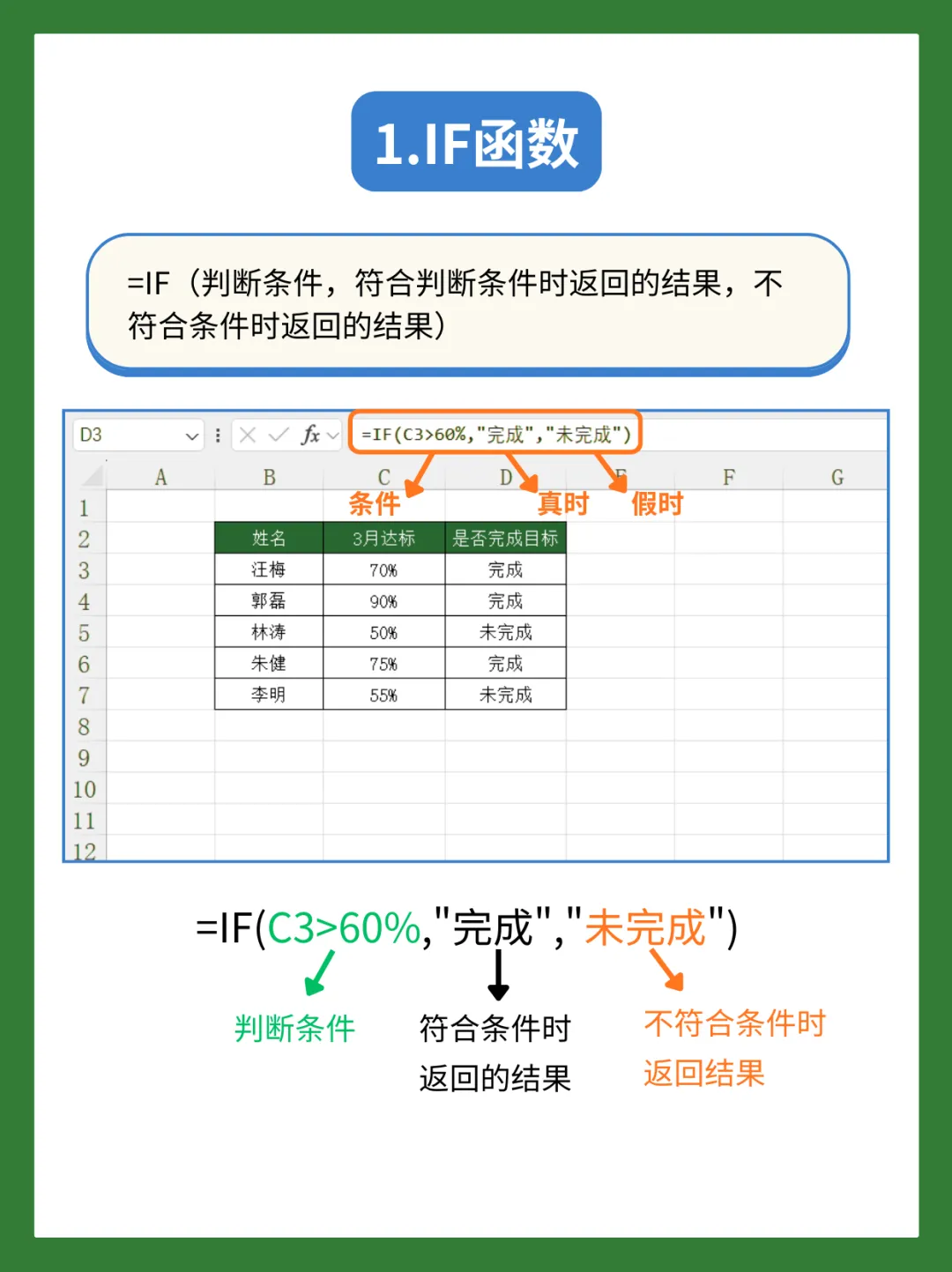 比如判断员工3月业绩是否达标(达标线 60%):=IF(C3>60%,”完成”,”未完成”)