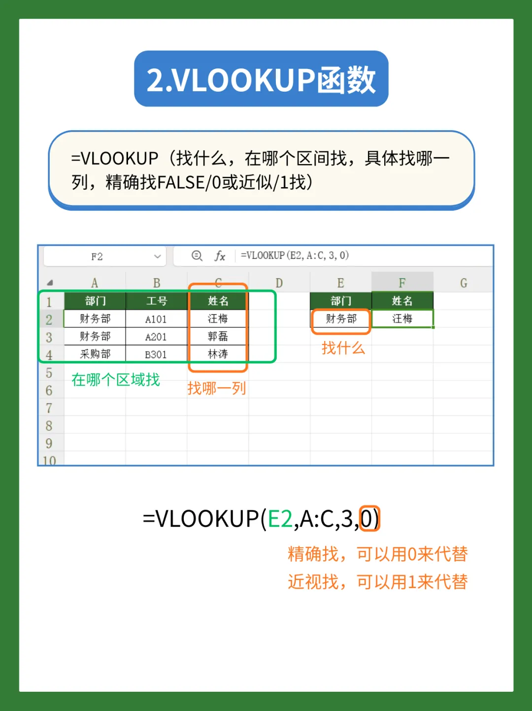 =VLOOKUP(找什么, 在哪个区间找, 具体找哪一列, 精确找FALSE/0或近似找1)