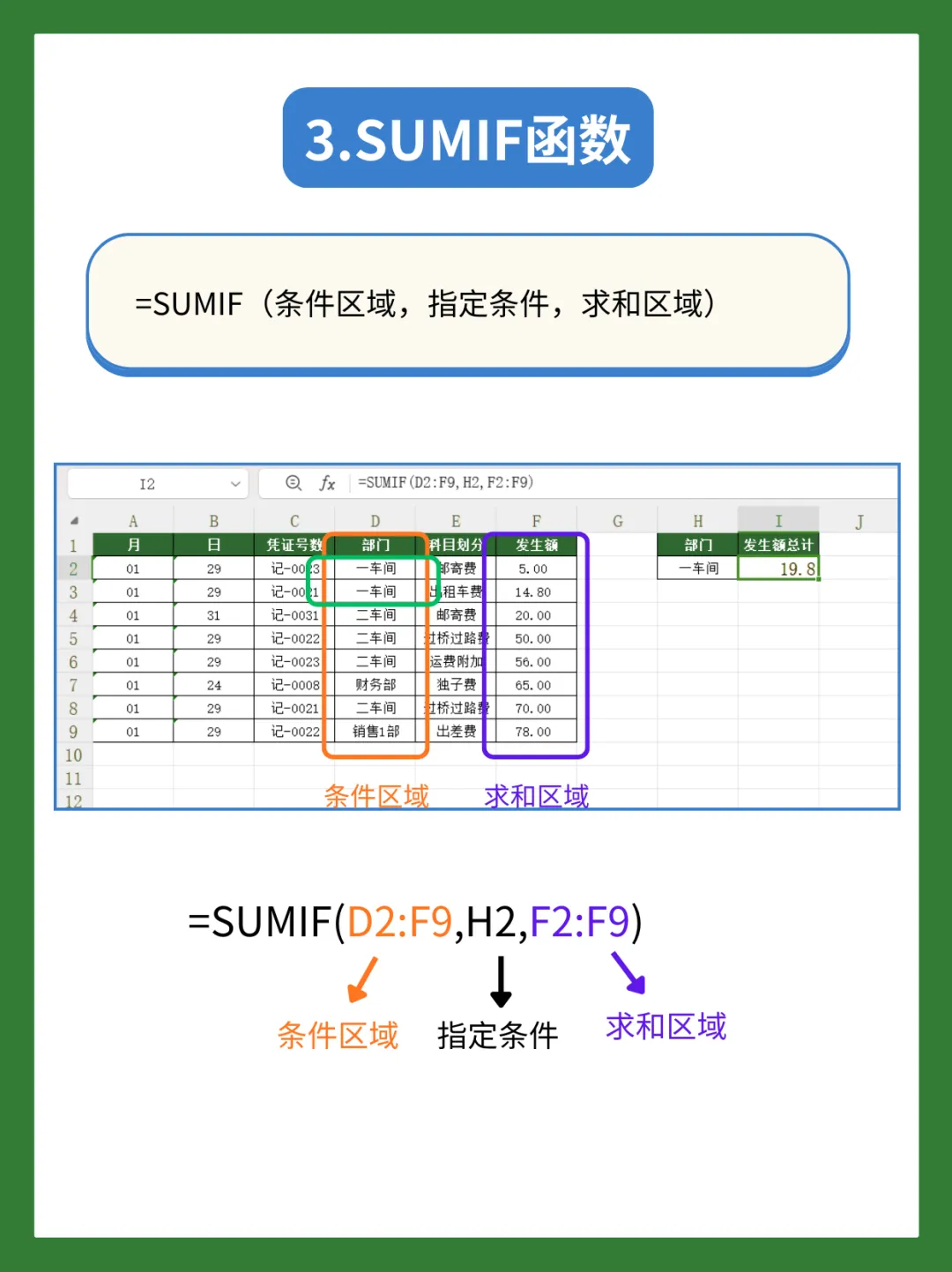 比如汇总一车间的费用发生额:=SUMIF(D2:F9,H2,F2:F9)