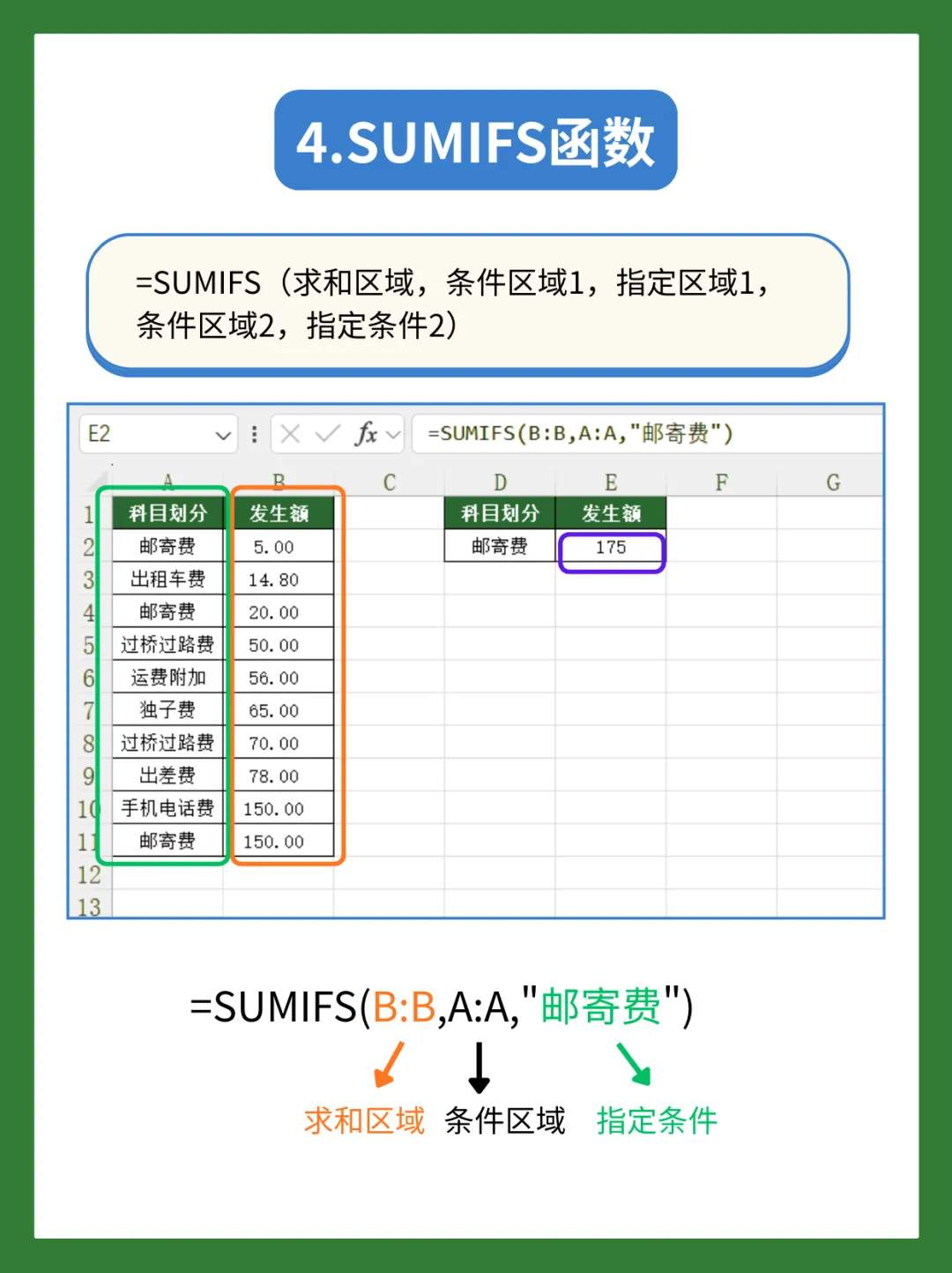 比如汇总所有“邮寄费”的发生额(单条件演示,多条件可叠加):=SUMIFS(B:B,A:A,”邮寄费”)