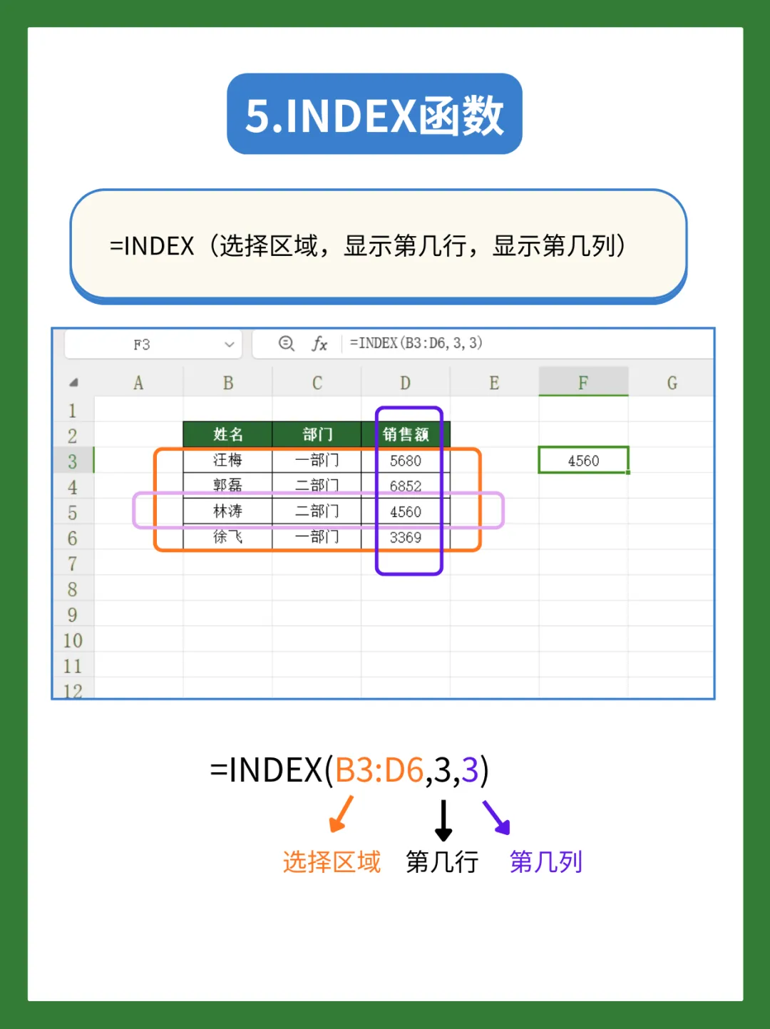 第几列:3(区域内的第3列,对应销售额列)最终提取出林涛的销售额4560。