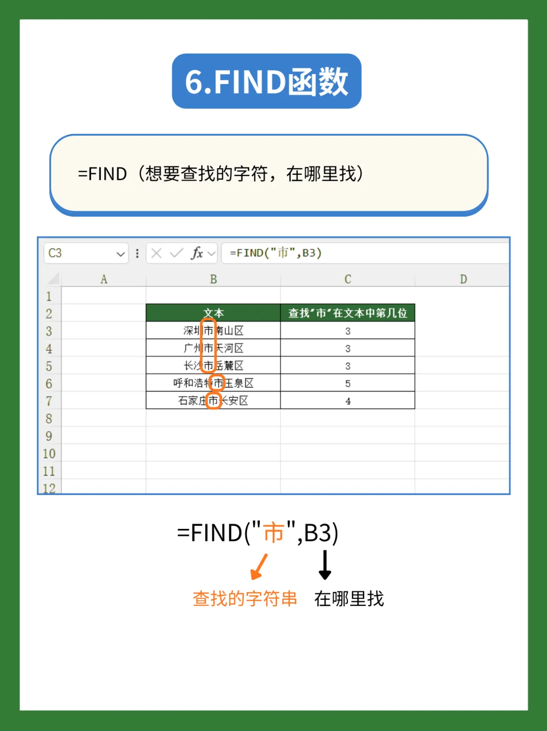 比如定位“市”字在地址中的位置:=FIND(“市”,B3)
