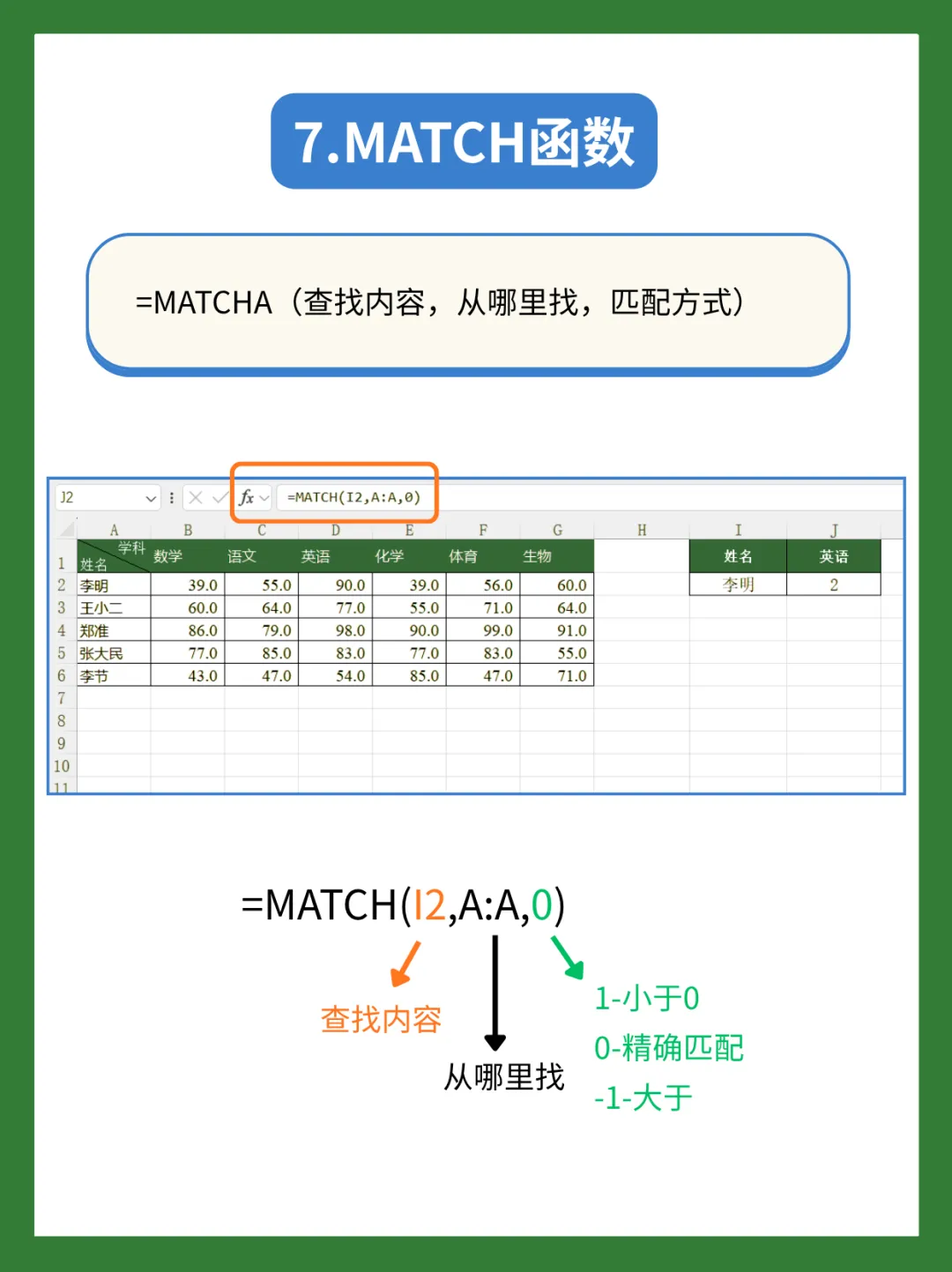 匹配方式:0(精确匹配,财务场景必用 0)公式返回 2,代表李明在 A 列的第 2 行。