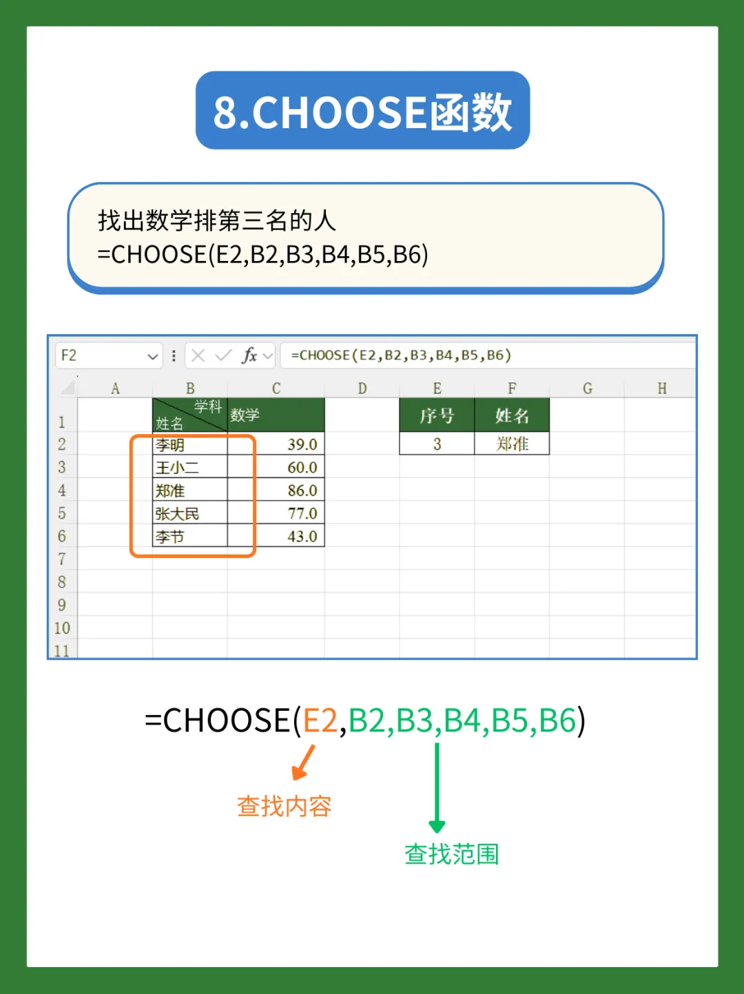 比如找出数学成绩排第三名的人:=CHOOSE(E2,B2,B3,B4,B5,B6)