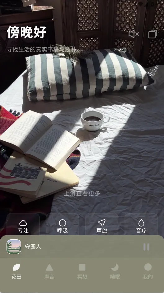 梵H田是一款助眠类应用,主打白噪音、睡前故事、冥想课程。